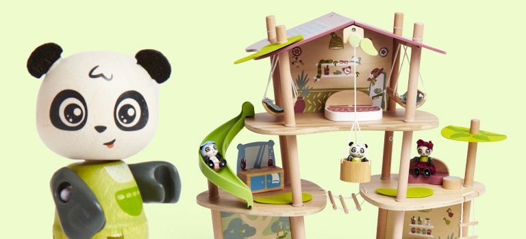 Este set de la gama Green Planet Explorers está fabricado con bambú sostenible y viene con una gran una variedad de elementos como una chimenea, hamacas, una escalera de cuerda e incluso un ascensor para sillas de ruedas. Combina esta casa con una familia de 4 pandas y seguro que pasarás horas jugando y viviendo muchas aventuras. También podrás aprender más cosas sobre la sostenibilidad y explorar la naturaleza. Ayuda a desarrollar las habilidades motoras finas, la imaginación, la creatividad y aprender sobre la sostenibilidad.