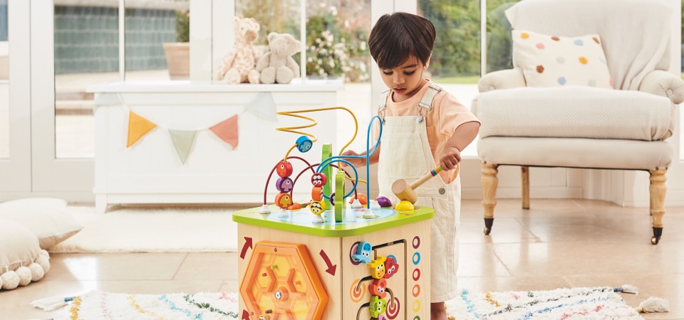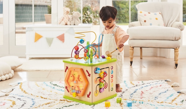 Este andador va a ser el compañero perfecto para los primeros pasos del pequeño. Es de madera y tiene velocidades ajustables que se adaptarán a su ritmo. Para mayor diversión, podrán jugar con los instrumentos y actividades incluidas: tocar el tambor, el xilófono o jugar con los tres bloques giratorios y el espejo. Este tipo de juguete ayuda a los primeros pasos y a la vez el niño descubre los juegos de encaje, engranajes y sonidos musicales.